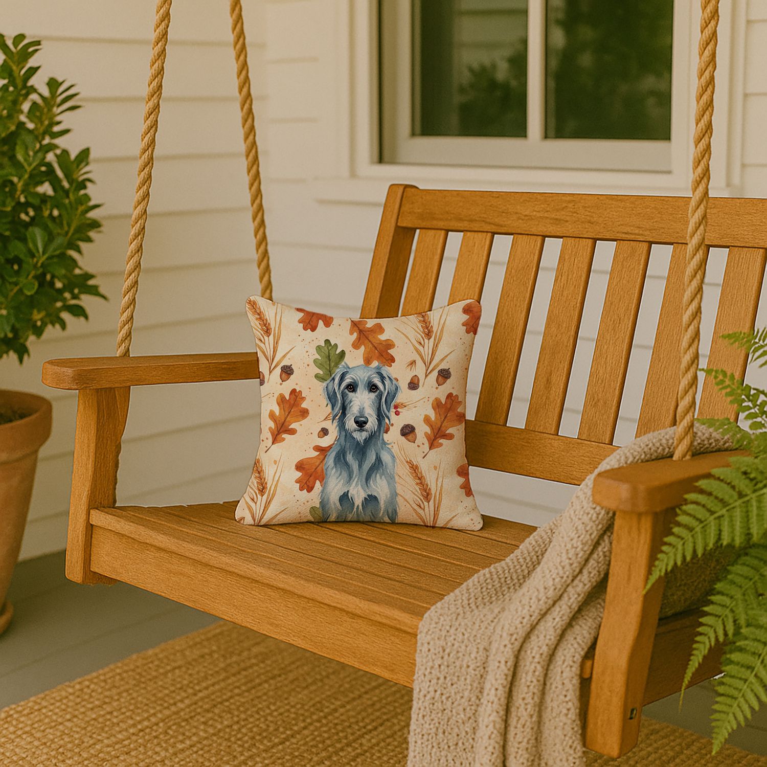 Throw Pillow featuring breed specific Scottish Deerhound artwork. Celebrate Thanksgiving with this Thanksgiving Pillow. Add a touch of vibrancy and comfort to your outdoor seating with Caroline's Treasures Fabric Decorative Pillow. Measuring approximately 14 inches by 14 inches, this outdoor pillow is crafted to elevate the appeal of your patio furniture, infusing it with vivid color and artistic flair. The pillow includes a 100% Polyester Fabric sham filled with a quality pillow form to provide superior comfort. Innovatively made from our brand new material, specifically woven for its water resistance, this pillow is designed for durability. The soft canvas fabric offers versatility in use, fit for your indoor couch or your outdoor patio, porch, or veranda. The fabric is dyed with colorfast dyes built for resilience against weather conditions, ensuring the pillow retains its beauty over time. Constructed by sewing three fabric pieces to create a sham, the polyester insert is then nestled inside to form the pillow, resulting in an overstuffed pillow that maintains its shape. Both the sham and the pillow insert are proudly made in the United States. As the pillows are handcrafted, there may be minor variations in size, further enhancing their unique charm. Experience comfort in style with Caroline's Treasures Fabric Decorative Pillow.