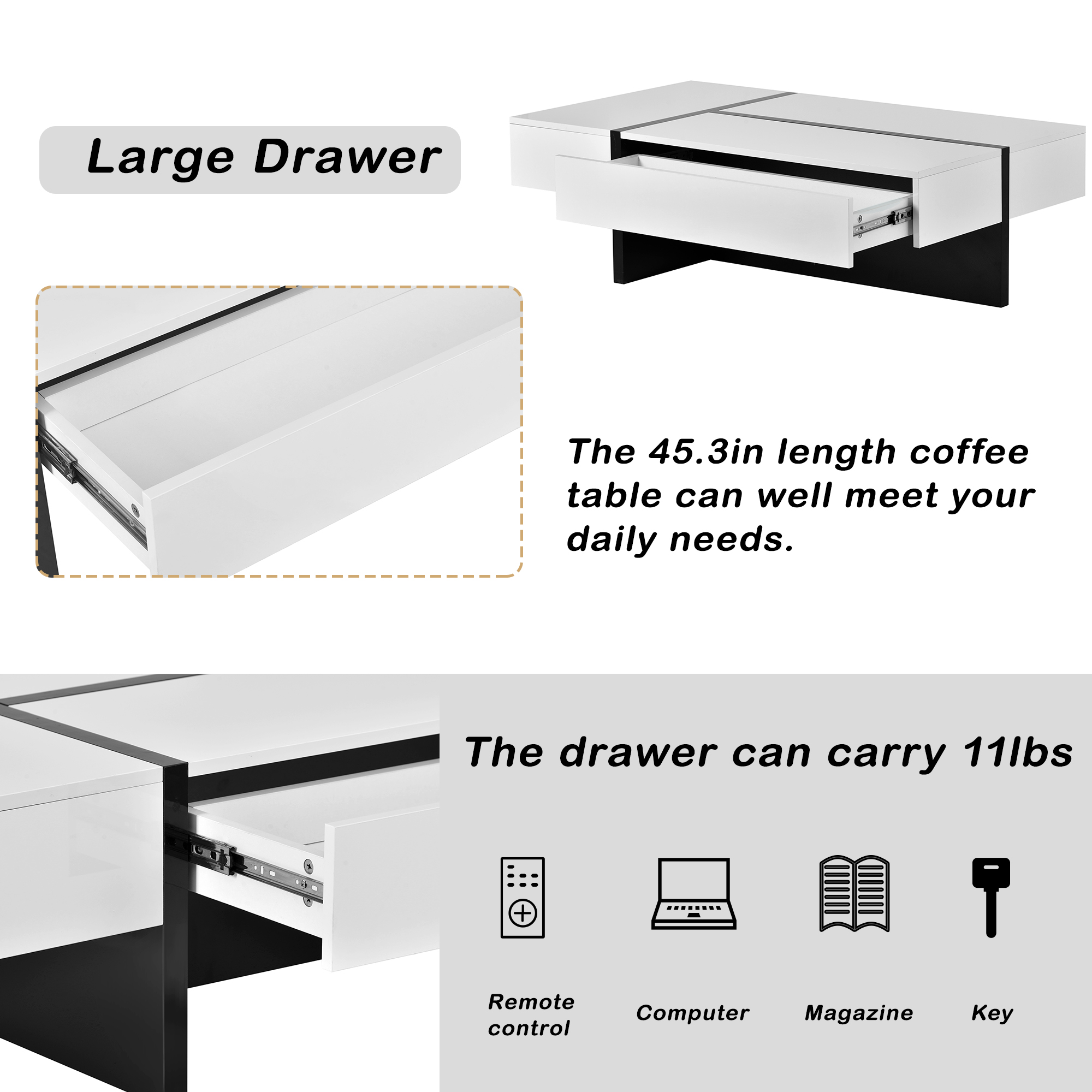 The 45.3in length coffee table can well meet your daily needs, such as placing vases, fruit baskets, tableware, etc. With a 29*9in large drawer, it can effectively store remote controls, card games or some office supplies.
