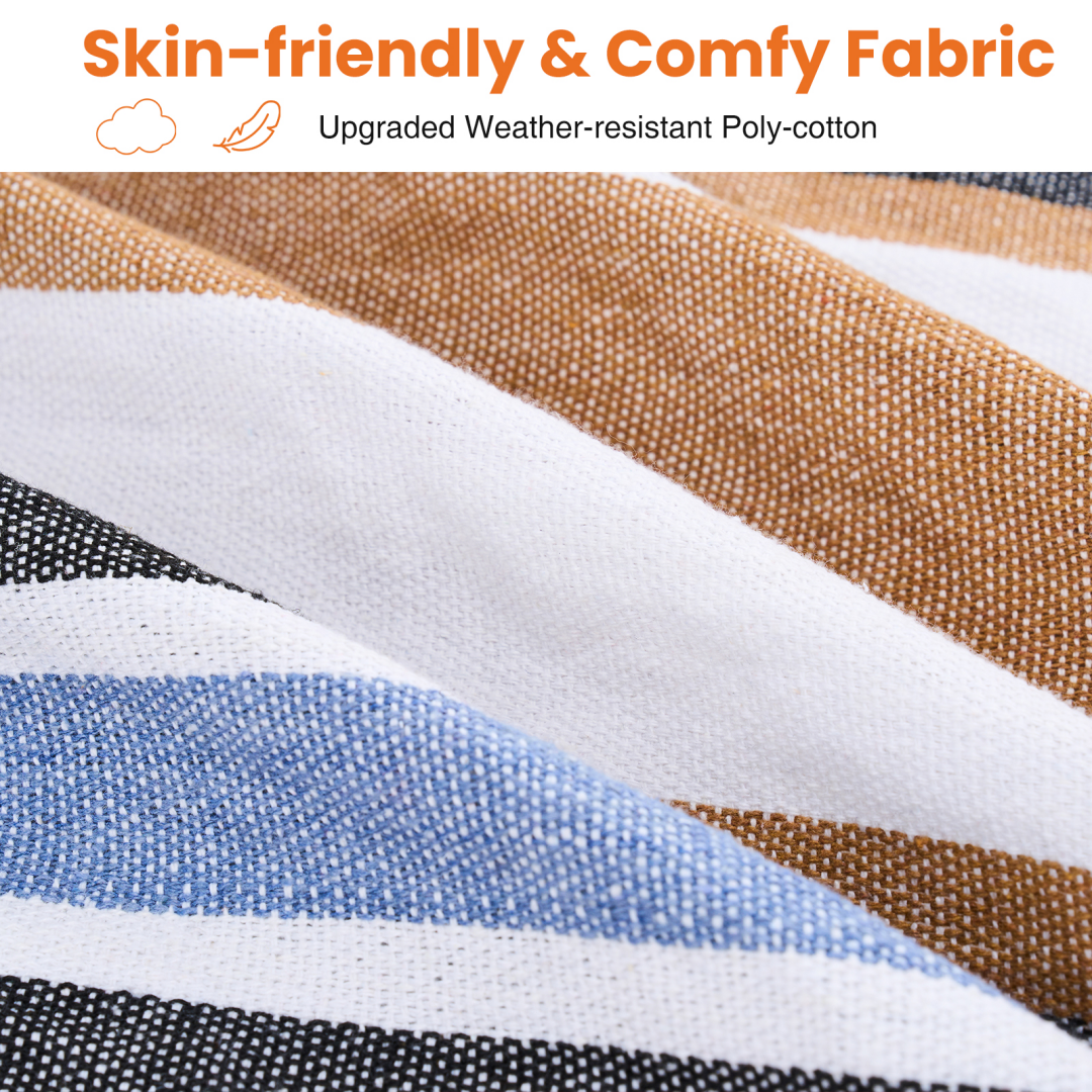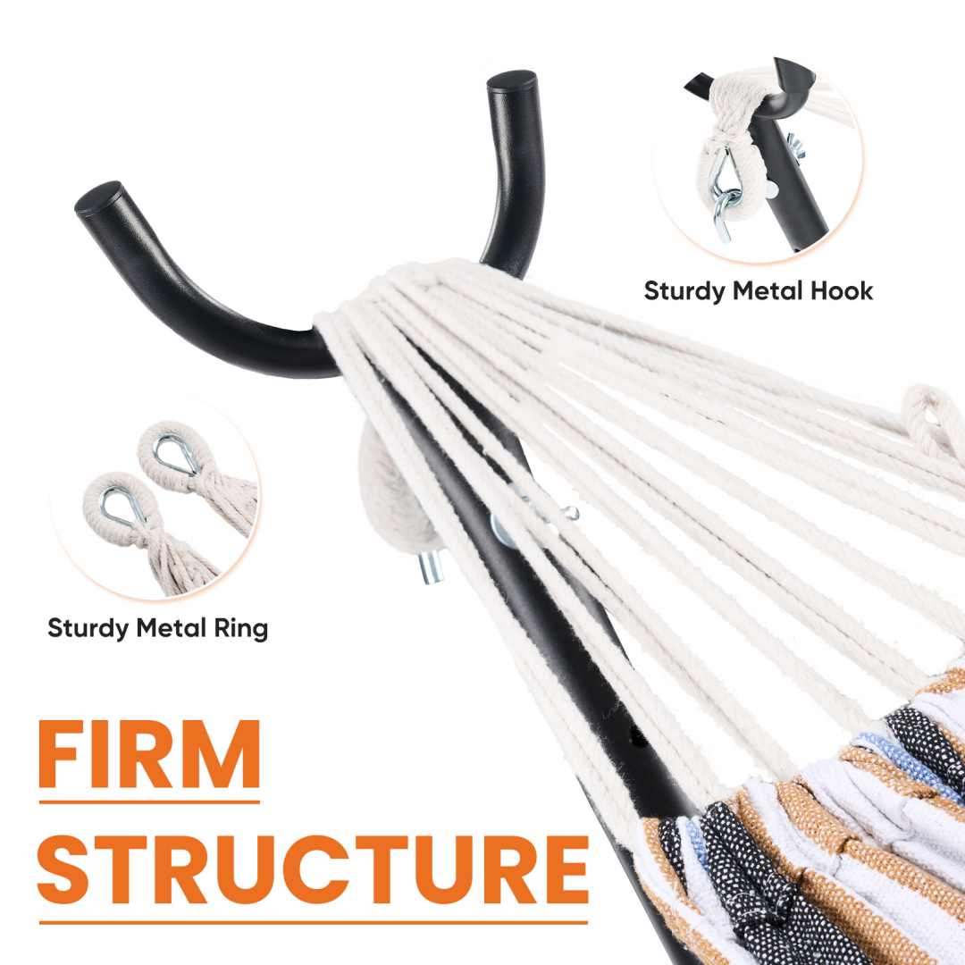 • 【Spacious & Strong for Two】Made with a durable steel frame and sturdy polyester-cotton fabric, this double hammock supports up to 450lbs—perfect for relaxing with a partner or stretching out solo.