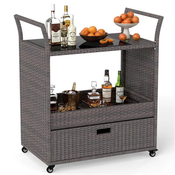 Home > Handwoven PE Rattan Outdoor Bar Cart With Tempered Glass Top & Drawer, 4 Wheels With Brakes Serving Cart For Patio