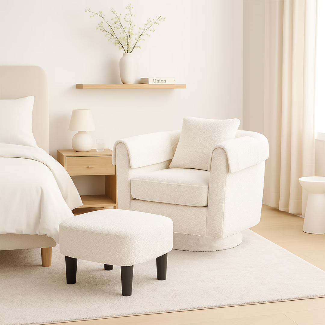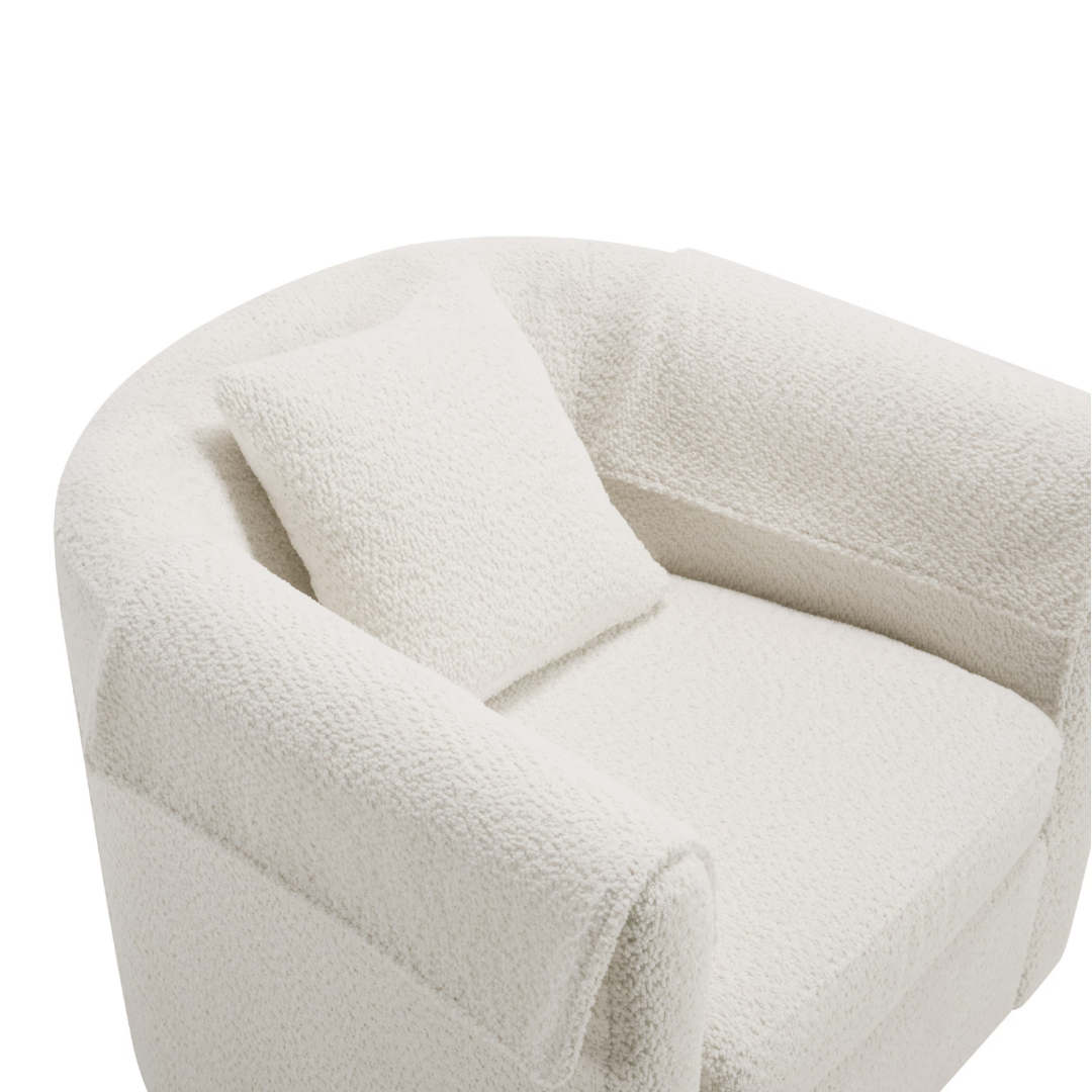 Product Name: Swivel Accent Chair with Ottoman Set, Modern Chenille Barrel Armchair with Removable Back Pillow & 2 Armrest Covers for Living Room, Bedroom, Office, White