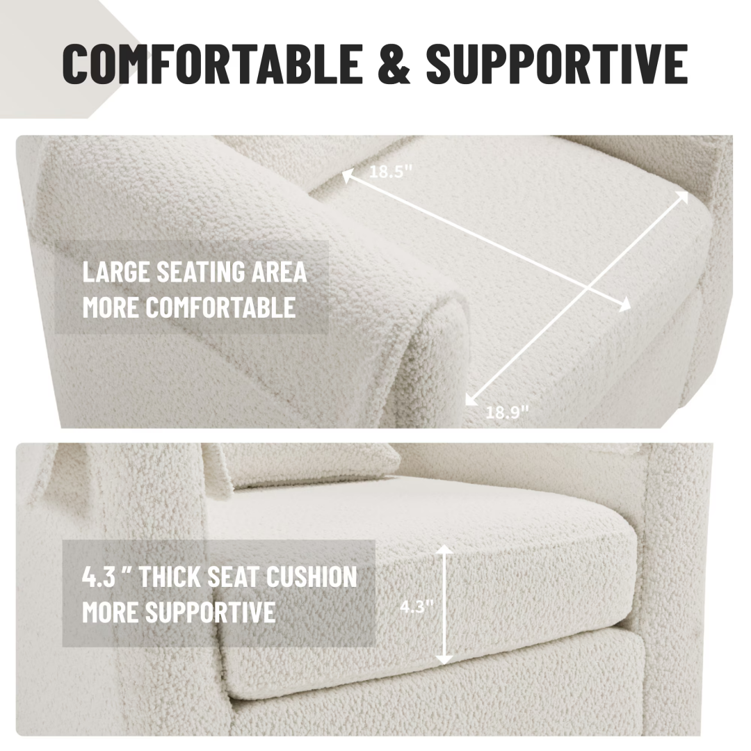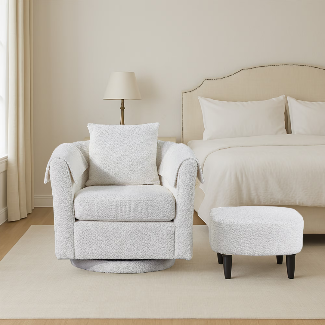 This 360° swivel accent chair with an ottoman set is a stylish and comfortable addition to any living space. The chair is crafted with a soft chenille fabric that feels luxurious. It features armrests and comes with a back pillow for added comfort.